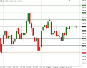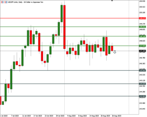 Setelah Ketua Fed Jerome Powell mengatakan “ Mungkin memerlukan penyesuaian sikap kebijakan kita” dalam symposium Jackson Hole pekan lalu, maka para pelaku pasar menyimpulkan bahwa pemotongan suku bunga Fed akan terjadi pada pertemuan September. Dari indicator CME Group Fedwatch terlihat 83,3% memprediksi pemangkasan 25 bps pada bulan September dan 78,7% Fed akan kembali memangkas 25 bps pada bulan Desember. Sedangkan di bulan Oktober terlihat Fed sepertinya kembali menahan suku bunganya pada level tertentu. Keadaan ini akan terus terjadi perubahan tergantung data ekonomi Amerika Serikat yang masuk. Para pelaku pasar saat ini tidak lagi berbicara mengenai pemotongan suku bunga, tetapi lebih focus terhadap seberapa agresif pemotongan terjadi, mengingat intervensi administrasi trump sangat kuat akhir akhir ini terhadap Fed. Dewan Gubernur Fed Lisa Cook diminta oleh Presiden AS Donald Trump untuk mundur dari jabatannya karena masalah hipotek ganda, dan kasus ini tentunya merupakan rangkaian serangan verbal Trump terhadap independensi Fed.
