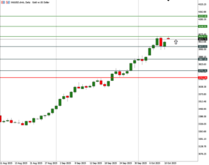 Walaupun sudah 3 kali terjadi pertemuan besar dan kerangka kesepakatan Amerika-China ditahun ini tetapi Perang Dagang kedua negara tersebut belum selesai bahkan kembali meningkat. Kamis pekan lalu China memberlakukan control ekspor baru pada rare earth element (mineral tanah jarang), dan China membatasi atau memperketat ekspor bahan penting buat industry chip, kendaraan listrik dan senjata canggih. China merupakan produsen utama mineral tanah jarang di dunia, dimana 70% – 80% mineral ini diekspor termasuk ke Amerika Serikat dan sekutunya. Keadaan ini direspon oleh Presiden Amerika Serikat Donald Trump dengan memberikan tambahan tarif masuk barang dari China sebesar 100%, yang sebelumnya tarif efektif untuk impor China hanya dikisaran 50%. Perang dagang dari kedua negara ini membuat pasar keuangan Amerika Serikat melemah, dimana indeks saham Dow Jones turun 1,9%, S&P 500 turun 2,7% dan Nasdaq turun 3,6%, setelah Trump membatalkan untuk bertemu dengan Presiden China Xi Jinping, di Korea Selatan pada pertemuan APEC. Ketidakpastian yang tinggi menyebabkan safe haven dapat kembali diburu para pelaku pasar.