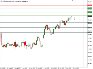 Pada tanggal 7 November Perdana Menteri Jepang, Sanae Takaichi menyampaikan pernyataan di Parlemen bahwa “ Jika China melakukan tindakan militer atau mengerahkan kapal perang dan kekuatan bersenjata lainnya – maka hal tersebut bisa dianggap sebagai situasi yang mengancam kelangsungan hidup Jepang”. Pernyataan ini membuat Beijing tersinggung dan menyebabkan hubungan Jepang – China memanas akhir akhir ini. Keadaan ini merupakan salah satu factor dari melemahnya mata uang Yen di tengah ketegangan Asia. Selain itu Jepang masih tetap menjadi pemegang obligasi AS terbanyak selama 9 bulan berturut turut, disaat transaksi pembelian asing terhadap T-bonds AS turun tipis. Keadaan ini membuat Perdana Menteri Jepang kemarin bertemu dengan Gubernur Bank of Japan untuk melakukan konsolidasi masalah tekanan ekonomi dan pasar finansial yang terjadi. Hasil dari pertemuan tersebut Kazuo Ueda mengatakan bahwa Sanae Takaichi mengerti kondisi yang terjadi dan meminta laporan rutin dari BOJ terkait dengan kebijakan moneter. Pelaku pasar masih melihat ketidakpastian yang tinggi di pasar Asia maupun global, sehingga safe haven masih menjadi perhatian investor.